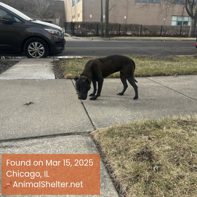 Looks like a pit bull but may be a mix. Cost is black brindle with dark brown undertones. Scared but friendly and hungry. Seems young but not a puppy.DID YOU FIND OR SEE THIS PET?