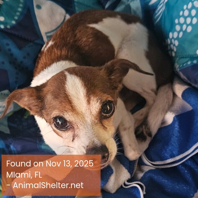 Please spread the word so we can find this pet's owner! FOUND in the middle of the road on SW 87th Ave and a block south of 32nd Street -Close to Christopher Columbus High School. Picked him up so he would not get hit. He is chipped but not registered. Please contact 305-305-5722. Will be able to hold him for a few days. Description: Small white and brown dog- Must show proof this dog is yours.DID YOU FIND OR SEE THIS PET?