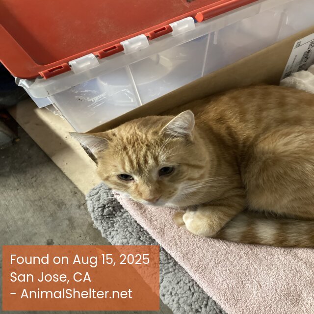 Sweet orange tabby approximately five years old not neutered but vaccinated for rabies feline leukemia And feline aids. Very friendly and loving. Doesnβt bite scratch or swat. I cannot adopt due to partner severely allergic however Iβve been taking care of him in condo garage. Please if you are missing the sweet boy contact me ASAP. Or if you want to adopt him, contact me as well.DID YOU FIND OR SEE THIS PET?