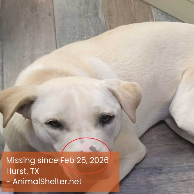 Lost in Hurst, Texas, 76053 Labrador Retriever MIX, MALE, white Cream with Birthmarks above his nose. - Microchipped. A Reward is avaiable for a SAFE return, No Questions Asked. Please contact 682-503-1598DID YOU FIND OR SEE THIS PET?