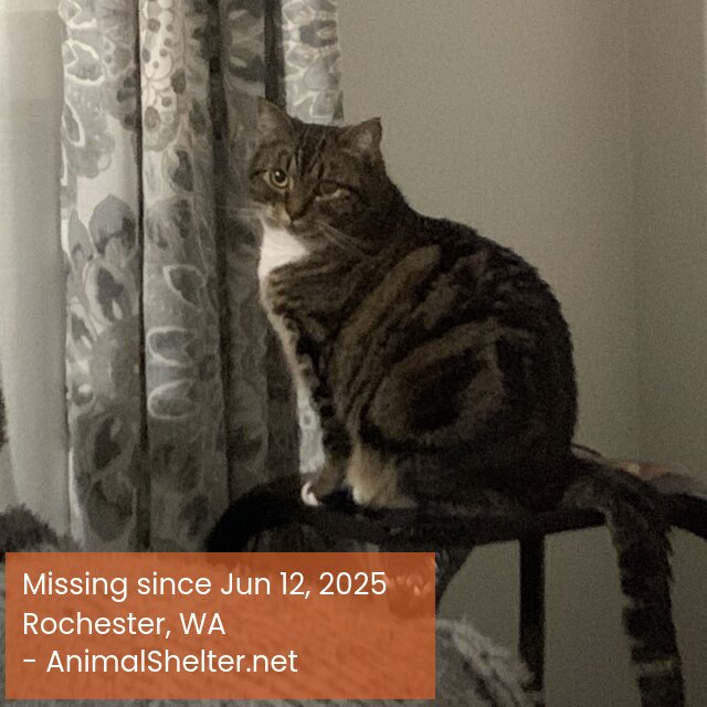 Grey and white striped cat. Strips look like a target on her sidesDID YOU FIND OR SEE THIS PET?