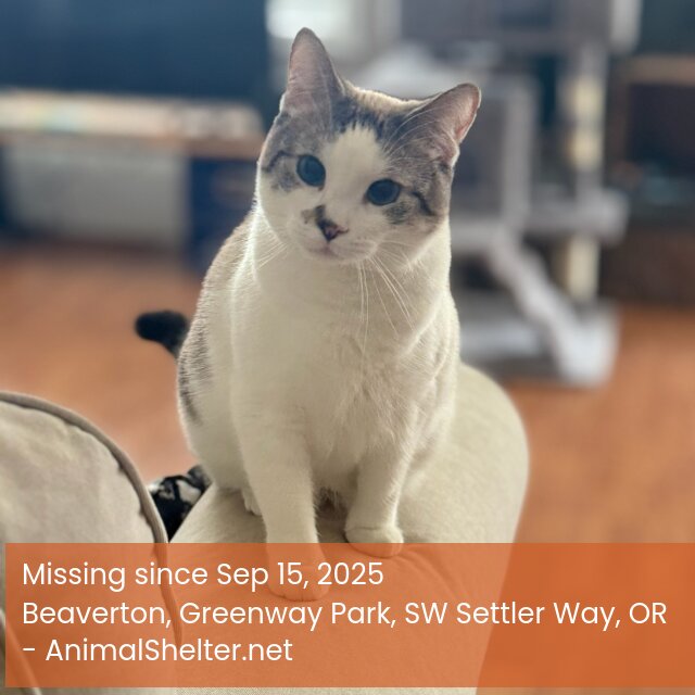 Lucy has mostly white fur, a grey saddle and cap, blue eyes, striped tail, a grey spot next to her nose and hind leg, micro chipDID YOU FIND OR SEE THIS PET?