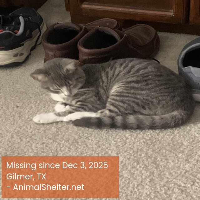 Grey black tabby/white chest and paws and its age looks Young.