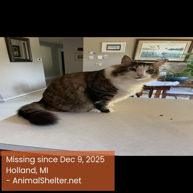 12yo male, Norwegian Forest Cat, 20#(normal weight for weegies), VERY friendly/spoiled/loved. We think he dashed out on the morning of 12/9/25 when the garage door was opened. We do have a cat door so he is inside/outside but predominantly stays inside or in the fenced in backyard. Very safe neighborhood, we live on a dead end road abutting a forest(Wolters woods).DID YOU FIND OR SEE THIS PET?