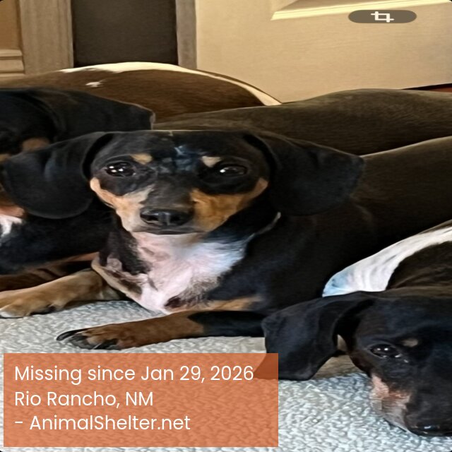 Dachshund with white chest and black and dapple markings wearing a bark collarDID YOU FIND OR SEE THIS PET?