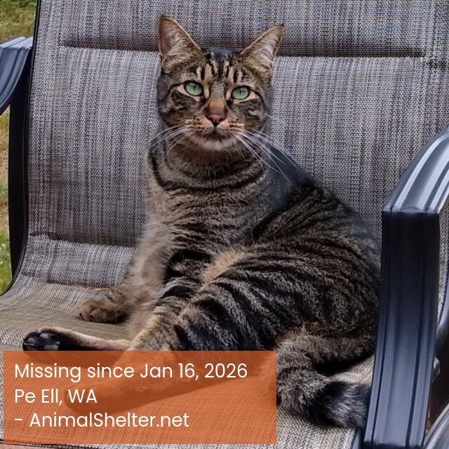 Dark gray & black tiger-stripped cat; chipped & neutered male; green eyes (sometimes yellow); not too friendly unless he knows you; a bit of white on upper lips just under his nose; lower jaw & chin is white; also on the back left side if his rump in the wide black streak there are 6-12 white hairs. He has a black dot on his tongue. Please call/text with any information or sightings!!!!DID YOU FIND OR SEE THIS PET?